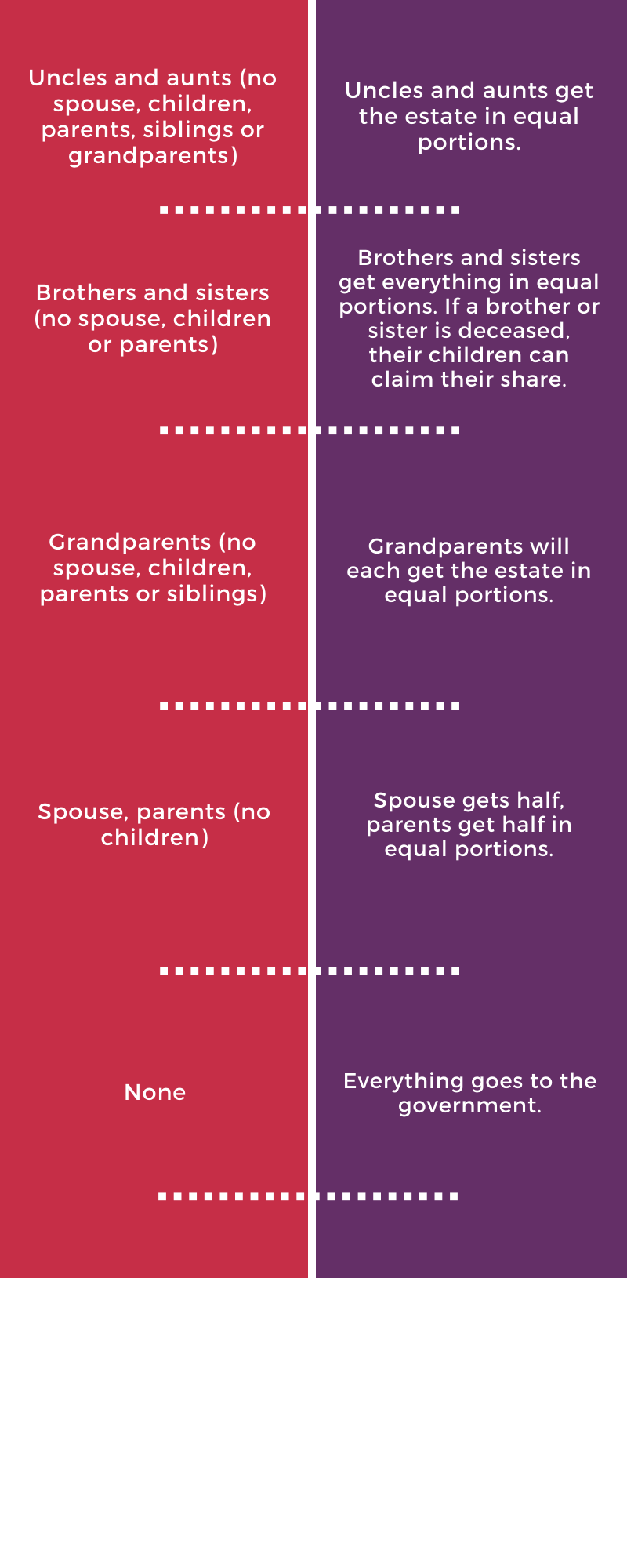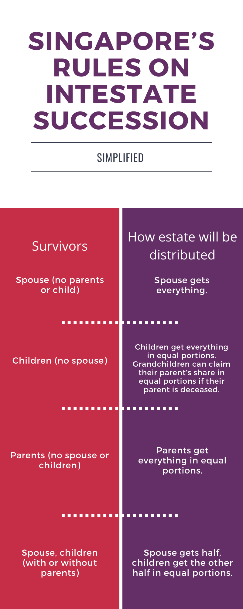 If the deceased did not leave a valid will behind before he passed away, Singapore’s rules on intestate succession will determine how the deceased’s estate is distributed to the survivors.